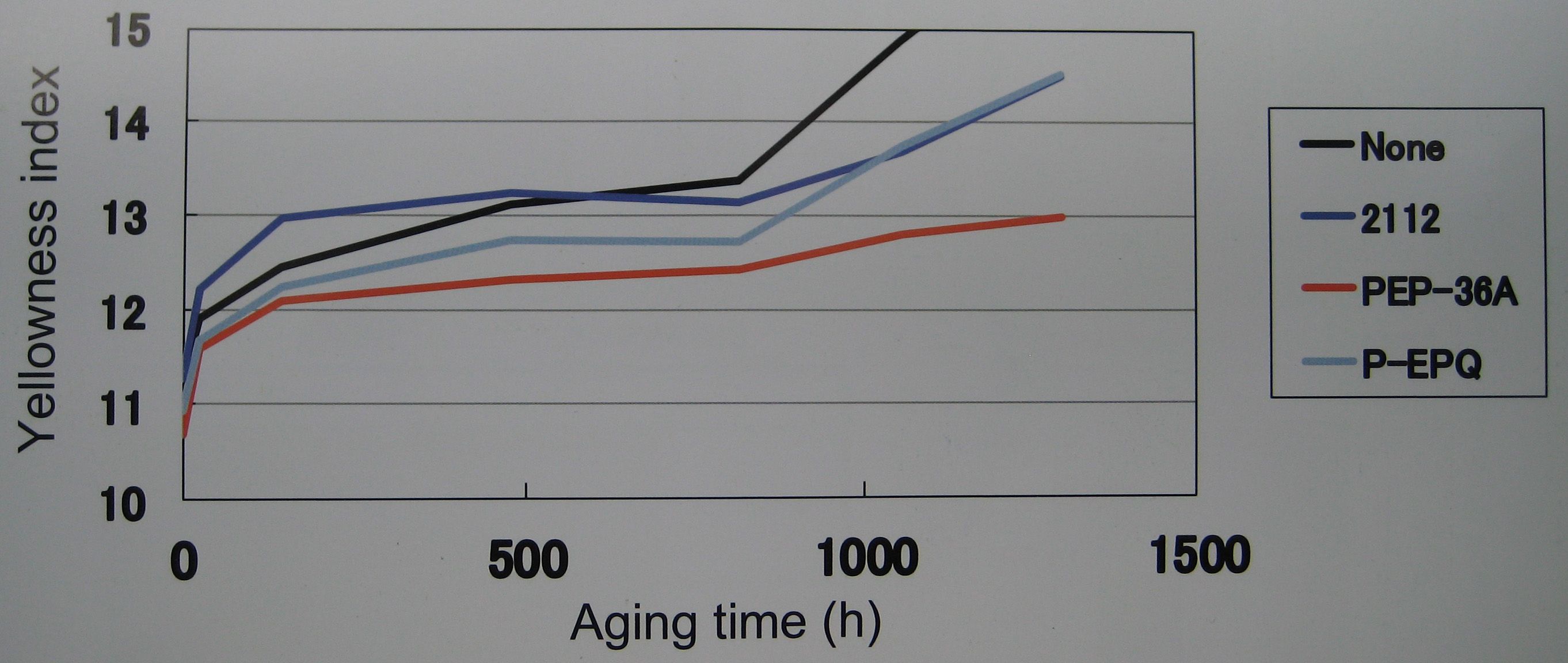3、PP在130℃烘箱內的耐熱性比較(黃度指數比較)